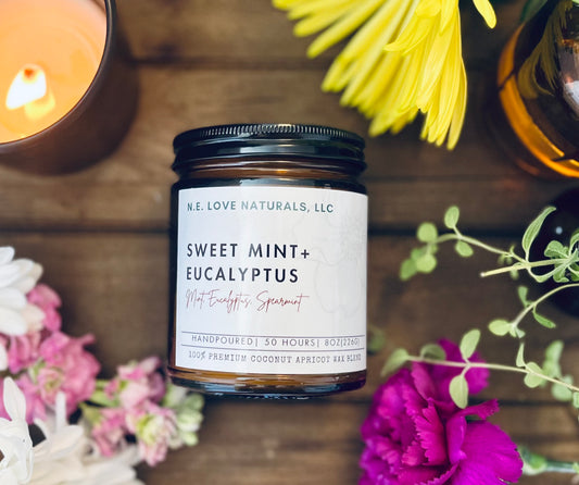 Sweet Mint+ Eucalyptus| Coconut Apricot Soy Wax Candle in Amber Glass Jar