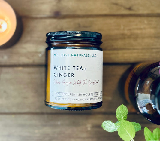 White Tea + Ginger| Coconut Apricot Soy Wax Candle in Amber Glass Jar
