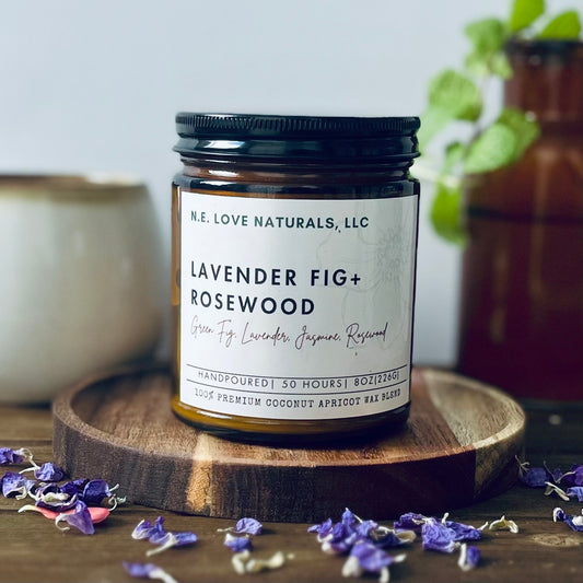 Lavender Fig + Rosewood |Coconut Apricot Soy Candle in Amber Glass Jar